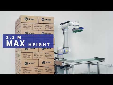 The Dobot all-in-one palletizing workstation is equipped with high-performance DOBOT CR20A cobot, with a maximum payload of 20kg and a maximum palletizing height of up to 2,100mm. This effortlessly meets palletizing needs across industries such as 3C electronics, healthcare, food, and beverage. The palletizing pace can reach 8-12 pcs/min. It can flexibly switch different production lines to meet various production needs.
